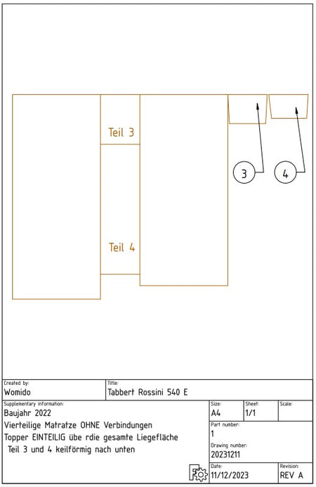 The sheet for your Tabbert Rossini 540 E topper is ONE PIECE and for the mattress it consists of four individual parts.