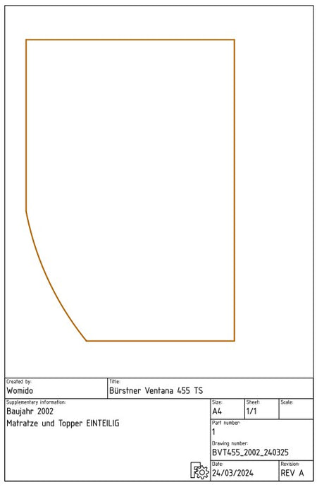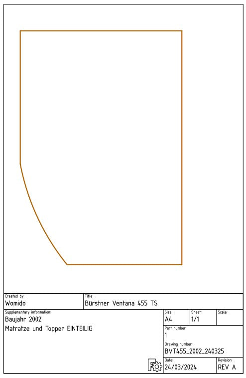 For your Bürstner Ventana 455 TS caravan from 2004 , we offer you a ONE-PIECE 4 cm high cold foam topper with a density of at least 40 kg/m³.