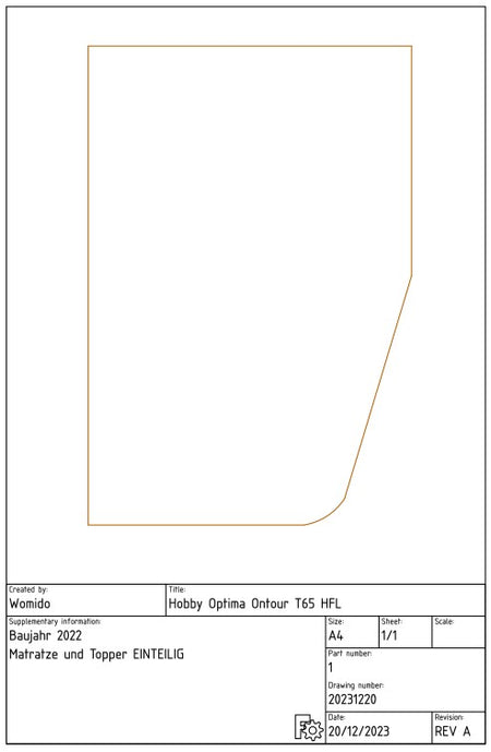 For your Hobby Optima Ontour T65 HFL from 2022 , we offer you a 4 cm high, ONE-PIECE cold foam topper with a density of at least 40 kg/m³.
